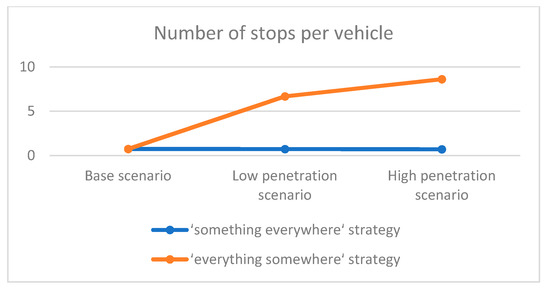 More analytically, in [38], the software developer provides general guidelines concerning the calibration of the PTV Vissim parameters for different driving behaviors of AVs, i.e., cautious, normal, all-knowing. It can be concluded that the values of the respective parameters are equal or more close to the default values in the case of cautious and normal driving behavior and significantly varying in the case of all-knowing driving behavior. This study, as it was previously explained, assumes that AVs will adopt a more conservative approach, i.e., cautious/normal driving behavior when they will have to share the roads with human-driven vehicles compared to a more aggressive approach, i.e., all-knowing driving behavior when they will operate on dedicated infrastructure. Having that in mind, studies aiming to evaluate the impact of different driving behavior modes of AVs were consulted [26,36,37]. After reviewing the applied values, this study adopted most of the values that are consistent with the PTV AG recommendations and adjusted specific values to provide a noticeable change in AVs driving behavior in the “something everywhere” strategy compared to human-driven vehicles and a more drastic change in the “everything somewhere” strategy. For instance, the standstill distance was reduced from 1.5 m (default value) for human-driven vehicles to 1 m for AVs in the “something everywhere” strategy and to 0.5 m for AVs in the “everything somewhere” strategy. The last column of Table 5 explains how the value of each listed parameter was determined. It should be noted that only the recommendations on driving behavior parameters that can be modified within the PTV Vissim program were considered for this analysis since this study strives to evaluate the operational effects of AVs based on different policy decisions.