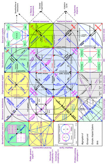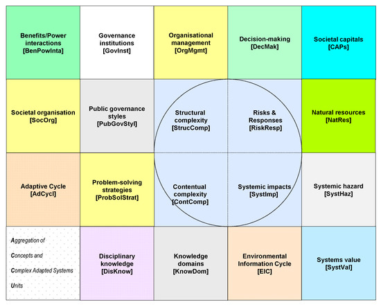 Social-ecological systems and governance are complex systems and crises that affect those systems are likely to be complex as well. Environmental topics are multi-faceted with respect to both structure and content. Structural complexity is about societal and institutional organization and management, whereas contentual complexity deals with environmental (or societal) analyses, knowledge, and problem-solving. Interactions between both are manifold, and it is essential they are included in decision-making. Describing these interactions results in a series of nineteen units, arranged in a matrix according to their prevailing mutual dependencies. These units show dominant processes and concepts, representative of environmental analysis. This approach, called ACCU (aggregation of concepts and complex adapted systems units), is provided with evidence through practices of, in particular, water governance.