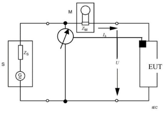 Testing circuit according to EN6100-3-2 [2]. S—source, Zs—source impedance, M-PQ analyzer, Zm—impedance of measurement device, EUT—equipment under test, Ih—current, U—voltage measured at terminals of EUT.