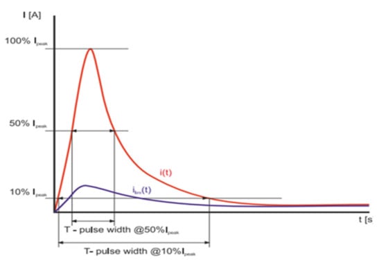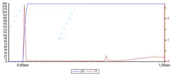 The experiment was performed several times for each LED fitting to obtain the worst possible Ipeak for each LED fitting current input (Figure 12). As we have seen in the theoretical part of this paper, the value of Ipeak and pulse width depends on circuit parameters including the construction of the LED driver and impedance of the voltage source. Taking into consideration that the test was performed on a real supply grid, values from datasheets of LED drivers could not be achieved.