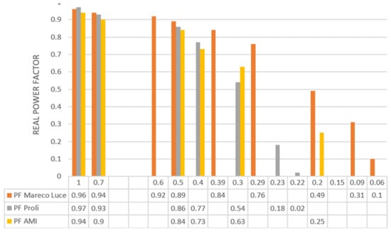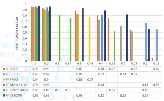 For all this, however, we should respect the requests of national or European standards but as far as we know, for illumination fittings, there are only some data on obligatory and THD, inrush current is still not present in COMMISSION REGULATION (EU) 2019/2020 of 1 October 2019 [29], not even at rated power. Power factor is obligatory for rated power but not in dimmable range. Therefore, we cannot expect producers to present to us all these data related to the dimming level of lighting fittings.