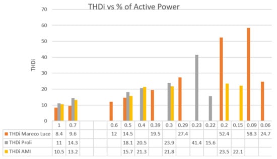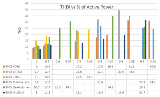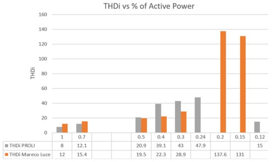Generally, the situation over the market is presently better from a power quality point of view. Looking at an article: “Analysis of electrical and photometric quantities of CFL (compact fluorescent lamp) and LED bulb lamps” [9]. In 2017, when fluorescent bulbs (CFL) were compared with LED bulbs, we could assume that we have moved from typical THDI 100–120% of CFLs and 30–80% of LEDs to a maximum at 20–30% at rated power. Obviously, here we refer to better LED filings where producers have physical space to place LED drivers on lagers PCBs with much better parameters than those in actual LED bulbs constrained to place LED drivers within a few cm3 and moreover significantly pushed by the market to limit the market price. In that case, it is obvious that producers are implementing simple converters with limited filter capabilities. Discussed issues became more significant for dimmable products if we push them to their limits [12,13,14,15,16].
