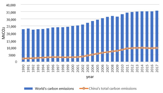 Carbon emissions situation of the world and China. Data source: Official website of the Global Carbon Atlas. (http://www.globalcarbonatlas.org/cn/CO2-emissions, accessed on 15 May 2021).