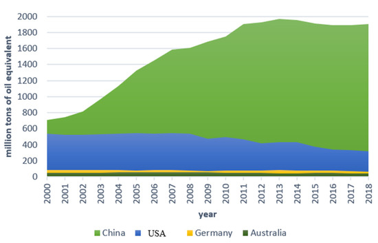 Comparison of coal consumption between China and major countries around the world. Data source: Wind database (https://www.wind.com.cn/, accessed on 15 May 2021).