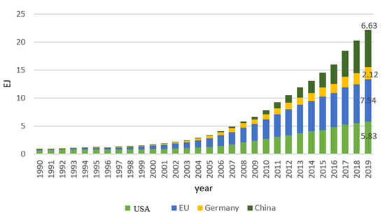 Environmental information disclosure had a weak effect on carbon emissions reduction by promoting the development of renewable energy. It can be seen that the positive impact of renewable energy needs to be improved. The development of renewable energy in China started late, but the development speed was very fast. By 2019, the consumption of renewable energy in China was only lower than that of the EU compared with other major countries, which reflects the broad prospects of China’s renewable energy consumption (as shown in Figure 4). Corresponding to the greater consumption demand, the production capacity of renewable energy in China currently has a lot of room for improvement. Compared with the development of global renewable energy production capacity, there is a large gap between China and the world in this field, and China also lags behind the world in terms of development speed, which not only leads to the expansion of the gap between China and the world in this field but also directly affects the domestic demand for renewable energy consumption (as shown in Figure 5). The development of renewable energy in China still has great potential.