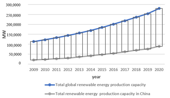 Comparison of renewable energy production capacity between China and the world. Data source: Wind database (https://www.wind.com.cn/, accessed on 15 May 2021).