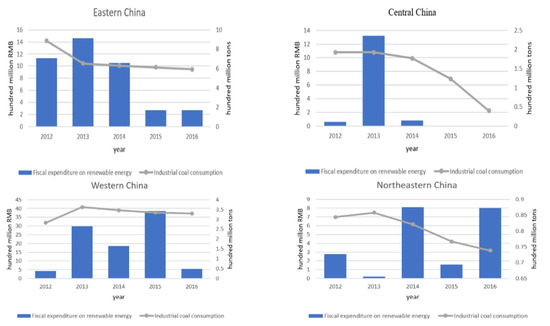 In addition, the regional support for renewable energy development will also directly affect its development level. Therefore, this study organized the government’s financial expenditure on renewable energy development in Eastern, Central, Western, and Northeastern China and compared their expenditures with the regional industrial coal consumptions. This was conducted to explore the importance of renewable energy development in different regions and to understand the relationship between it and regional coal consumption changes. Since there was incomplete data for fiscal expenditure on renewable energy, the information may be incomplete regarding the summation of provincial data. This study selected, as much as possible, provinces with more complete data for regional aggregate reporting. Thus, the present situation in the four regions could not fully represent the overall situation of the region and could not be compared between regions. This part of the study focused on the relationship between the degree of financial support for renewable energy and the trend of regional coal consumption (as shown in Figure 6).