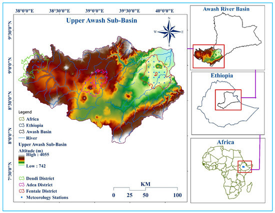 Awash is one of the 12 River Basins of Ethiopia. The basin is divided into three parts—lower, middle, and upper, based on the characteristics of physical, climatological, agricultural, socioeconomic, and water resources [62]. This research has been carried out in the upper part of the basin (Figure 1). Addis Ababa, the capital of Ethiopia, is situated at the northern end of the basin. The sub-basin is limited to the 37°54′35″ E–40°16′53″ E longitude and 7°53′15″ N–9°25′15″ N latitude boundaries, and the area is 24,545 square kilometers.