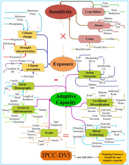 Figure 2 depicts the workflow of the indicators for each sub-component of the IPCC–DVI and their interaction. In total, 10 indicators were recategorized into 3 sub-components, 8 indicators regrouped into 3 sub-components, 38 indicators reclassified into 6 sub-indicators made the exposure, sensitivity, and adaptive capacity major components of the IPCC–DVI. As illustrated in Figure 2 and Table 2, if the indicator contributes to the increment of the sub-component, the relation is represented as positive, and plus marks were put in the workflow line. If the indicator influenced the sub-component negatively, then the relationship is negative, and hence, minus sign was used to show this correlation [66].