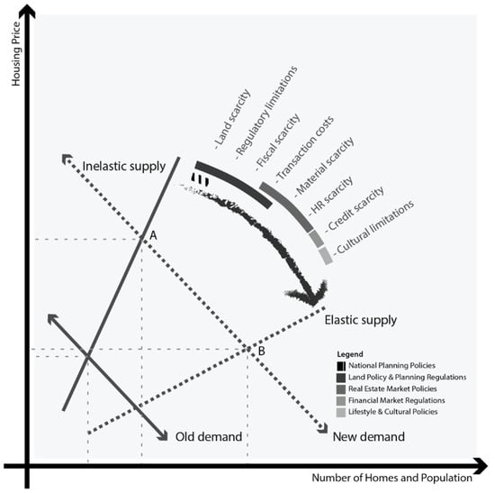 At times of demand shocks, public policies tend to focus on improving housing supply elasticity and therefore support market actors’ ability to ramp up housing production. In case housing supply elasticity is high, the real estate industry is able to react to demand shocks in a timely and efficient manner. In the case of inelastic housing supply, however, prices will rise notably [28]. In developing economies facing challenges of rapid urbanisation, insufficient housing supply in combination with excessive demand from migration will result in increasing housing prices and problems of housing unaffordability. Despite this unaffordability, the urbanisation trend will not stop, and informal, sub-standard settlements will emerge. This is politically and ethically undesirable, and the public sector will take measures to overcome limitations to housing supply by supporting the real estate industry.