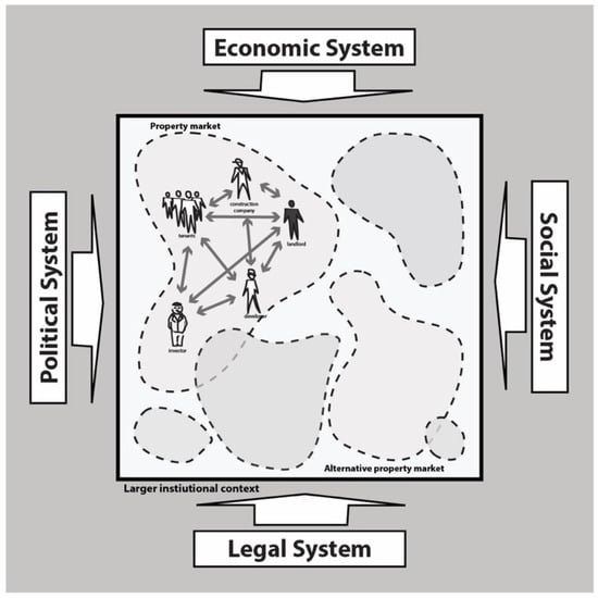 The property market is an artificial construction of institutions, which reflects participants’ patterns of power and influence embedded in the larger institutional framework of political, economic, legal and social systems [3] (see Figure 2). Property market mechanisms, particularly the production, exchange, distribution, use [42] and maintenance of built structures [26], affect the output of the property market. Developer strategies define which locations to target, what quantity and typologies of housing to provide, the amount of overhead capital investments and the timing of housing provision in practice [43].