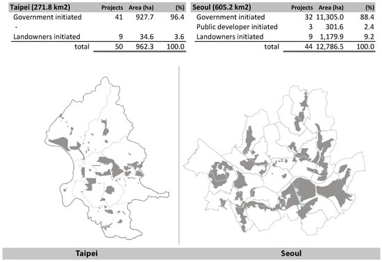 Land readjustment projects in Taipei and Seoul. Source: Taipei City—Department of Land Administration, 2020; Seoul Metropolitan Government, 2017.