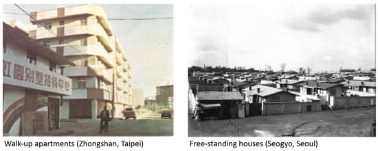 While these policies helped reduce transaction costs and promoted vertical integration in the real estate industry, they limited the efficient use of land by promoting low-density housing developments [76]. It would have been more efficient to revert to walk-up apartments with higher dwelling-to-land ratios, but cultural limitations—specifically the lifestyle of living on the floor—required the use of a floor heating system (ondol) that limited the applicability of mid- or high-rise housing typologies as long as affordable centralised floor heating and elevator systems were not available. Additionally, in Taiwan, housing typologies changed with rapid urbanisation: from the early 1960s onwards, the Bureau of Public Works—with aid from the United States—introduced modern, four-to-six-floor walk-up apartments based on Western models. These typologies were chosen for their high land-to-dwelling ratio, which could be achieved without the need to provide costly installations such as elevators [77] (Figure 5). Cultural limitations played a lesser role in Taipei, as floor-based living was not common and construction materials, human capital and know-how were less scarce than in Seoul when land readjustment projects boomed in Taipei. However, the fragmented land ownership after land readjustment did not always match developers’ demand in Taipei, who preferred to negotiate with a smaller group of landowners [78].