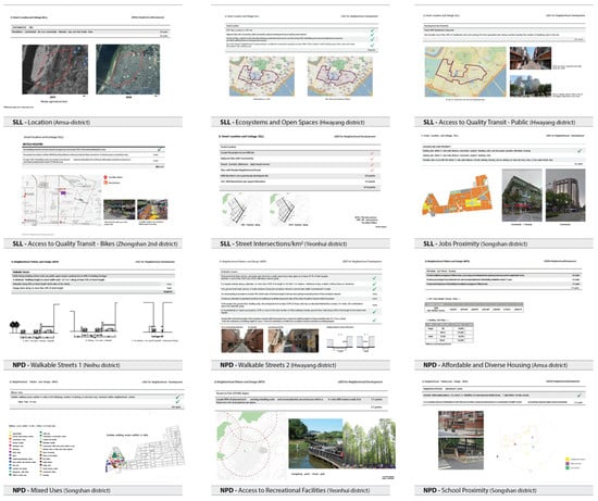 The study assessed the ecological outcomes of public policy initiatives and developer strategies at times of rapid urbanisation in six selected sites in Taipei and Seoul. The LEED ND framework provides detailed evaluation standards for each of the assessment dimensions [13]. The research scoured publicly available data, such as official planning documents, maps, satellite images, photographs, census statistics, construction drawings and public transportation schedules, among others, which have been analysed according to the detailed LEED ND guidelines. Due to the large size of the land readjustment sites, part of the questions in the NPD section have been assessed on the basis of a representative sample. Evidence of the calculations of the respective scores for each question has been collected in a digital presentation and is made publicly accessible (see the data accessibility statement). Figure 6 gives an overview of typical assessment sheets for the six selected sites and their calculations in both the SLL and NPD categories.
