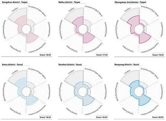 The first set of diagrams describes the outcome in the SLL category (Figure 7). The scores diverge between 17/25 in Neihu, Taipei and 20/25 in Hwayang district, Seoul. Due to the limited dispersal, we can speak of a high level of coherence in ecological performance among the selected cases in both countries. The distribution of the points within the studied dimensions also shows a high level of coherence. All selected sites score high in the Transit Oriented Locations, the Jobs and Housing Proximity and the Cycling Facilities dimensions. However, scores among the selected sites were low for the Location dimension and very low for the Ecosystems and Open Spaces, as well as the Contaminated Sites dimensions.