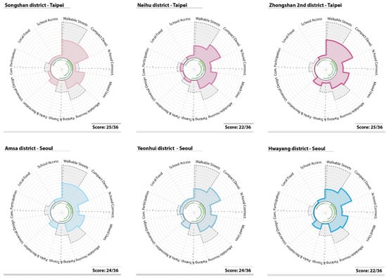 The assessment of the NPD category also shows a high level of coherence among the selected sites in both countries (Figure 8). The divergence between the highest-scoring sites (Songshan and Zhongshan 2nd district) and the lowest-scoring sites (Neihu and Hwayang district) is only 3 points. Scores for the categories of Compact Development, Neighbourhood Connection, Mixed Use, Access to Parks and Recreation and Schools were perfect. On the other hand, the selected land readjustment sites barely score in the Parking and Transportation category and in the Universal Design category. The score for Affordable and Diverse Housing is even among the selected sites. All score 3 points in the Housing Diversity category but fail to score any points in the Affordability and Public Rental Housing dimensions. The lowest points for all sites were scored in the Walkable Streets category, where the score ranges between 4 and 6 points out of a possible 12. The main reasons for the low score in this category are the lack of available space for parking, the absence of sidewalks among the majority of streets and the lack of shade-providing trees in public space.