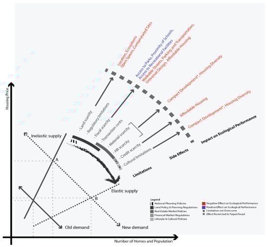 We find that Taipei and Seoul employed similar policies to support the housing supply. Figure 7 and Figure 8 illustrate how these policies have typically impacted the ecological score of the investigated sites in Taipei and Seoul according to the LEED ND system. The study reveals how most limiting factors were overcome in the two East Asian cities discussed here (Figure 9). We also find that not all policy interventions necessarily have had side effects that impact the ecological performance of the built urban landscape. Policy measures to overcome regulatory limitations as well as those related to transaction costs are included in the land policy interventions and therefore do not have to be addressed separately. However, some of the ecological effects of the policies supporting housing supply elasticity concern only the case of Seoul, where a standardisation policy was employed to overcome the limitations of material and human resource scarcity, while the limitations deriving from a culturally embedded lifestyle were accepted.