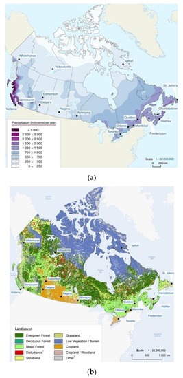 Spatial distribution of precipitation (a) and land use (b) in Canada [5].