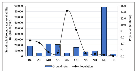 Groundwater is a major source of fresh water in Canada and about 9 million people (30% population) depend on it for potable water. It is fulfilling 82%, 43%, and 14% of the water requirements of the rural population, irrigation, and industry, respectively, at the national scale [15,18]. Regional use of groundwater varies considerably across Canada as it fulfills municipal purposes in Ontario, Prince Edward Island, New Brunswick, and the Yukon; livestock watering in Alberta, Saskatchewan, and Manitoba; serves industrial purposes in British Columbia, Québec, and the Northwest Territories; and feeds domestic wells in Newfoundland and Nova Scotia. Non-uniform distribution of water resources considerably increases dependence on groundwater. Most of the groundwater is extracted from shallow aquifer depths of 20–100 m, up to a maximum depth of 200 m. This is because shallow groundwater is easy to extract and is of good quality [15]. Provincial distribution of sustainable groundwater availability (40% of recharge) and its respective populations is shown in Figure 3.