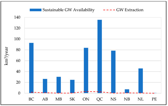 Regional analysis of groundwater was spatially segregated at a larger scale as follows. West Coast: British Columbia (BC); Prairies: Alberta (AB), Saskatchewan (SK), and Manitoba (MB); Central Canada: Ontario (ON) and Quebec (QC); and Atlantic Canada: Nova Scotia (NS), New Brunswick (NB), Prince Edward Island (PEI), Newfoundland, and Labrador (NL). Nevertheless, individualistic provincial situations are presented. The information is graphically presented to better grasp regional variations and discussed in comparison to the sustainable limits.