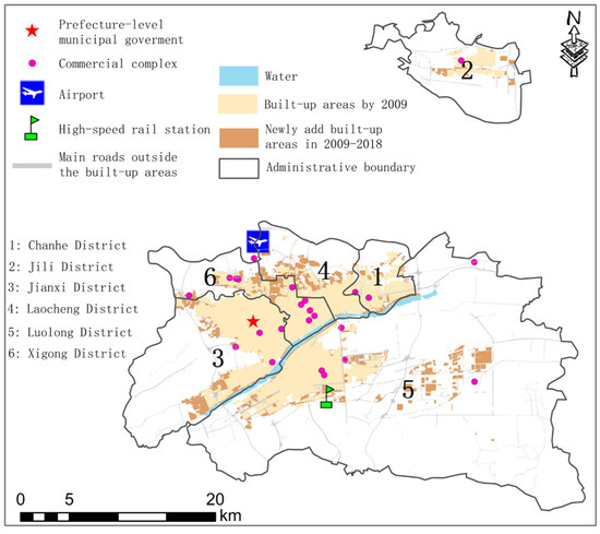 The 2009–2018 built-up area data was from the Chinese second national land survey data. Built-up area data for 2010–2018 was derived from a year-by-year land change survey database based on second national land survey data in 2009. These time series data had the same survey standard, with a coordinate system of CGCS_2000 and in vector format. Data surveys were led by national institutions to accurately grasp land use types and changes. Due to the combination of remote sensing images, aerial photography, and a large number of field surveys, this data source has higher authority and accuracy than the traditional land cover data based only on remote sensing image interpretation. The basic geographic data involved in this article, such as road networks, government centers, airports, water bodies, and commercial distribution, were directly extracted from this database (see these elements in Figure 1). The population density data was derived from the global 1 km grid distribution database by the National Oak Ridge Laboratory [12]. The 1 km resolution overcomes statistical deficiencies based on administrative district surveys and can express population distribution characteristics on a more refined scale [23,24]. The land price data was from the national land transaction database. The information contained in the database for each transferred land piece included the location, the specified use, the transfer area and the transfer price. The location Geocode interface provided by Gaode Maps was used to obtain the spatial positions of 1818 parcels sold in the study area from 2009 to 2018, and the average price was calculated according to sold area and price. The final spatially continuous average price distribution of land sales from 2009 to 2018 was generated using the spatial interpolation tool in ArcGIS.
