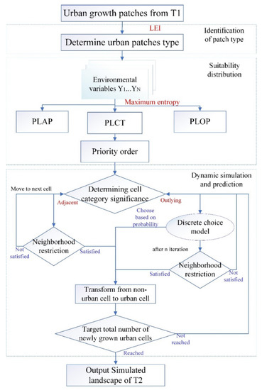 According to the landscape expansion index [13,14,15], newly expanded urban patches can be classified into either edge, infill or outlying types [10,16]. Edge expansion refers to the extension of urban built-up areas along the original urban patch and infill expansion occurs in the internal voids patches, both of which can make the original urban built-up area more compact. Outlying expansion is a leapfrog development of land far away from the original urban land and can make the city more diffusional [7]. Few scholars have tried to improve traditional CA models to simulate outlying-type expansion. Clarke proposed an improved CA model called SLEUTH, which can randomly select newly generated points to generate extensional expansion [11], but the proliferation of new urban patches is not completely random. In fact, the occurrence of the new patches is the result of multiple driving forces [5]. As a result, SLEUTH may not be able to simulate a real urban proliferation scenario. Liu et al. proposed the SMDUGT model to simulate diffusion and aggregation in urban morphology evolution [6]. The basic idea of SMDUGT is to divide the expansion candidate areas of different expansion types based on regression results, and then consider neighborhood factors to construct the adjacent (edge and infill) and outlying (outlying) types. The cell conversion rules in the candidate regions for land-type expansion are integrated into the cellular automata model to obtain simulation methods for different types of regions. However, SMDUGT cannot determine where the “seed points” of diffusion growth are.