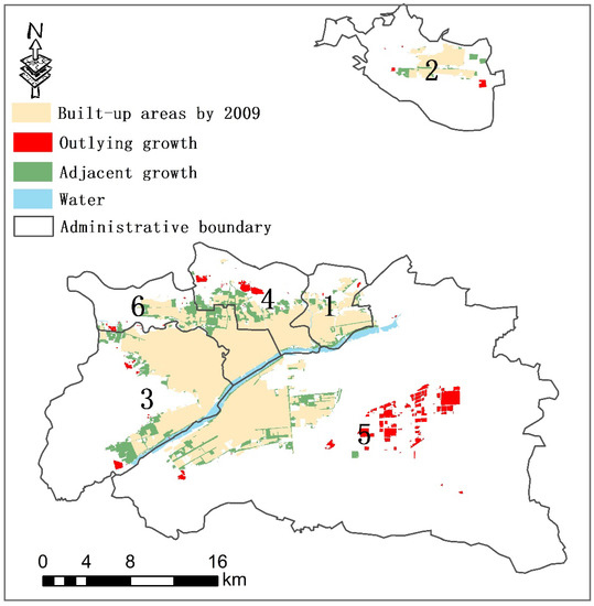 Urban growth type (UGT) in this article included two categories: adjacent and outlying. Adjacent UGTs refer to the expansion that transforms rural land villages within a city or cultivates unused land around the city into urban built-up area. In this type of expansion, new urban area is spatially adjacent to the original city. Outlying UGTs refer to when new urban area is spatially disconnected from the original built-up area, but the two areas are still functionally interconnected through transportation. Considering the definition of the relationship between the new and original urban patches in the literature [10], a landscape expansion index (LEI) was used to determine the type of each newly added urban patch and it was calculated as follows: