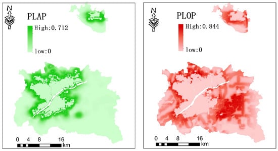 Figure 4 shows the distributions of PLAP and PLOP based on the MaxEnt model. As can be seen in the PLOP figure, high values were distributed in areas away from the original built-up areas. Statistically, 77.37% cells with PLOP were greater than 0.70 and were located away from the original built-up area exceeding 1 km. In the PLAP figure, the high values were distributed in areas significantly closer to the original built-up than that of PLOP, which corresponded to the characteristics of adjacent or outlying urban growth.