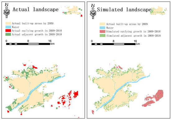 MaxEnt-CSCA generated more realistic local evolution rules for different types of urban growth patches to determine the temporal and spatial dynamics of urban expansion. GDAL and NumPy function libraries in the Python function library were used to read the starting year’s image into a two-dimensional array, arrange the priority of the cells, judge the significance of the cell category and start the cell iteration process. After iteration, the urban growth patterns in the main urban area of Luoyang from 2009 to 2018 were simulated (see Figure 5). The overall accuracy was 87.65%, the kappa coefficient was 0.78, and Figure 5 shows, the simulation distribution was similar to the actual urban pattern. Both the statistics and the visual interpretation confirmed that the model achieved good results. Not only was there clear adjacent expansion in the relatively compact area, but outlying-type growth also appeared in areas away from the original urban patches, which was a “patchy-like” expansion rather than a complete “diffusion” state, that matched the actual situation. In about 10 years from 2009 to 2018, the actual areas expanded by adjacent and outlying cities were 24.64 and 13.10 km2, respectively, and the simulation results from MaxEnt-CSCA were 27.22 and 10.53 km2, respectively. This verified that the MaxEnt-CSCA model can accurately predict expansion trends of urban built-up in Luoyang.
