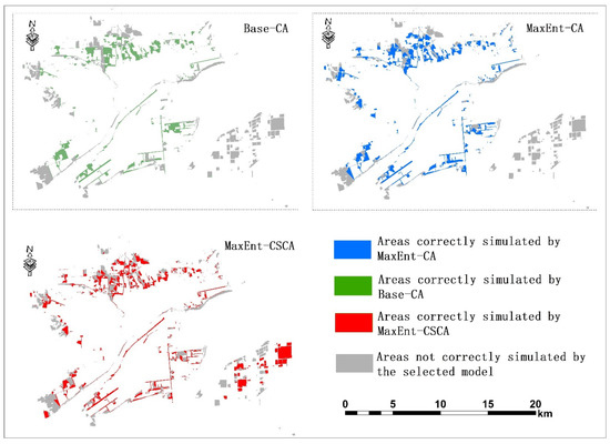 In simulating the historical evolution of Luoyang’s urban expansion, the spatial output and several indicators of the MaxEnt-CSCA model achieved good results, but this did not indicate the advancement of the model. Only by comparing it with other models can the superiority of MaxEnt-CSCA model be confirmed. Therefore, this article continued to simulate the urban expansion of Luoyang City from 2009 to 2018 using two other CA models: MaxEnt-CA model, which considers the cellular conversion potential but does not consider the spatial zoning, and Base-CA model, which takes into account neither cellular conversion potential nor the spatial zoning. Maxent-CA still used the maximum entropy principle to obtain the probability of non-urban cells becoming urban cells and the selected environmental variables were the same to avoid subjectivity. By arranging the conversion probability from high to low and traversing each cell from non-urban to urban if the neighborhood condition was satisfied; Base-CA, on the other hand, only considering the neighborhood limit (there are enough construction land cells in the 3 × 3 neighborhood). The simulation results of the three models (Base-CA, Maxent-CA, Maxent-CSCA) were compared with the actual built-up areas in 2018. The result was shown in Figure 6. Noted that Jili District (2), which is far away from the main urban area, is not drawn in Figure 6 for visual aesthetics. In addition to spatial accuracy, Table 5 also compared the statistical accuracy, i.e., kappa coefficient and areas corrected simulated (the area of overlap between simulated landscape and actual landscape) of the three models.