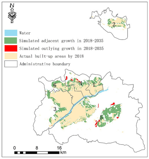 The MaxEnt-CSCA model proposed in this paper has been verified with good performance for predicting urban expansion patterns. Based on the urban construction patterns in Luoyang in 2018, the MaxEnt-CSCA model was adopted to predict the distribution of urban built-up areas in 2035, which is the last year of the Chinese Plan, called Long-Range Objectives Through the Year 2035. The spatial distribution is shown in Figure 7. According to the current development trend, an outlying UGT area of 8.69 km2 and an adjacent UGT area of 66.11 km2 are expected to occur between 2018 and 2035. The diffusion growth will decrease significantly and the urban pattern will become more compact. Luolong District (5) will have a large area of adjacent urban expansion in the future, and the newly added urban patches will fill the gap of the internal voids left by the outlying-type urban growth from 2009 to 2018. Luoyang’s urban form is expected to gradually mature in the next 15 years. With the development of the city, the urban expansion of Chanhe District (1), Jili District (2), Jianxi District (3), Laocheng District (4) and Xigong District (6) will mainly occur along the edges of existing urban patches, making the existing patches continue to grow larger. Outlying-type urban expansion will almost entirely occur in Laocheng District (4) and Luolong District (5), while the urban growth process will be different. The former outlying UGT will grow outside of the existing built-up and the latter will expand on the inner gap, which will first diffuse, and then merge together. It can be predicted that in the future, land resources available for urban development in Chanhe District (1), Jili District (2), Jianxi District (3), Laocheng District (4) and Xigong District (6) will decrease, which make the urban form very compact. Measures need to be taken to increase the degree of built-up intensive use to meet the needs of future social and economic development, and attention should be paid to the protection of agricultural land around these districts. Luolong District (5) is still rich in available land resources. As the city continues to expand in the future, Luolong District (5) will form a relatively independent built-up area and serve as Luoyang’s second center, which will share in urban function and the pressure in center Luoyang that are excessively concentrated.
