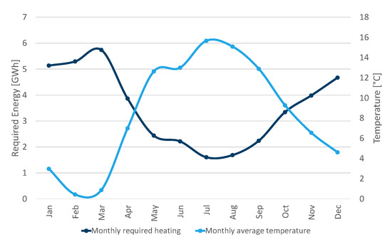 We assume constant heat capacity and air density, negligible solar radiation, and greenhouse temperature of 21 C and a surplus heat availability of 100 GWh/a available at an appropriate temperature, e.g., 70 C. These heating requirements can be put into perspective when considering Figure 1, which shows that 1357 GWh/a surplus heat in the range of 60–140 C is available from seven aluminum manufacturing installations in Norway [15,18]. It is also within the range of the available surplus heat for an aluminum plant reported by Skjervold [80]. With these considerations, we estimate that a 56,500 m greenhouse can be heated when the ambient temperature is C, which was the minimum daily average temperature in Karmøy in 2018 [81]. Then, we calculate the monthly heating requirements for the 56,500 m greenhouse considering the monthly average temperature in Karmøy [81], with the rest of the parameters in Equation (1) kept constant.