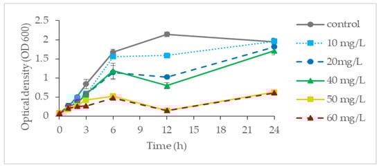In the present study, it was found that P. aeruginosa RW 9 can grow well and tolerate up to 40 mg/L Cr(VI), with an OD value ranging from 1.70 to 1.67 as compared to the control (1.71 ± 0.20). However, at a concentration of 80 mg/L, the OD (0.90 ± 0.06) was found to be greatly reduced and was considered as showing total inhibition at a concentration of 160 mg/L (OD, 0.33 ± 0.10). Considering the result obtained, the growth profiling of P. aeruginosa RW 9 was further examined at a concentration of Cr(VI) ranging between 0 and 60 mg/L as depicted in Figure 1. Despite the approximate OD value obtained at the end of incubation for Cr(VI) with concentrations of 0–40 mg/L, the growth profile obtained was fairly different. It was observed that cells exhibited slower growth relative to the control (μ: 0.63 h−1) as the Cr(VI) concentration increased from 10 to 20 and 40 mg/L, with μ of 0.54 h−1, 0.43 h−1 and 0.39 h−1, respectively. Towards the end of cultivation, the OD of cells at 20 and 40 mg/L was found to increase steadily after a slight drop at 12 h. At the 12th hour of incubation, at which the exponential phase was entered, the cells might have started to produce a secondary metabolite that helped them to thrive in an unfavourably higher Cr(VI) concentration, resulting in the increment of OD observed [18]. At 50 and 60 mg/L, the final OD600 were 0.62 and 0.60, respectively, which were about 70% lower than those of the control. The pattern observed might be attributed to severely damaged biomolecules and DNA as a response to chromium toxicity at high concentrations [25]. The result obtained was in agreement with the previous findings on the pattern of bacterial growth of a Pseudomonas strain reported by [26].