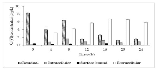 Time profile of Cr(VI) concentration in the broth (residual—patterned column), Cr(VI) accumulated in the cells (intracellular—grey column), Cr(VI) bound to the cell surface (surface-bound—black column) and Cr(VI) sequestered outside the cells (extracellular—clear column).