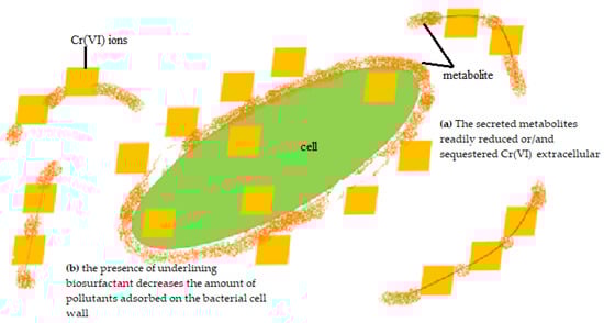 The highest removal efficiency was obtained for 10 mg/L, with a lesser effect on the cell growth (Figure 3). Thus, this concentration was chosen to further investigate the potential removal mechanism of P. aeruginosa RW 9, which was about 100 times the permissible Cr(VI) concentration for wastewater effluent [28]. It was observed that the Cr(VI) was reduced as early as 4 h, with a dominant mechanism of extracellular sequestration (Figure 4). The sequestration was speculated to be enabled by the production of membrane-associated products such as an extracellular enzyme (reductase) and biosurfactant, as depicted in Figure 5. These metabolites are predominant in most Pseudomonads [29]. The more the metabolites that were produced, the lesser the amount of Cr(VI) being adsorbed onto the cells. The secreted metabolites readily reduced and/or sequestered Cr(VI) to Cr(III) extracellularly. This prevented the penetration of the ions into the cell membrane since Cr(III) cannot readily diffuse into the cell membrane as Cr(VI) ions. On another occasion, it was reported that the presence of an underlining biosurfactant decreased the amount of pollutants adsorbed on the bacterial cell wall, thus protecting the bacteria from the toxicity [30]. The increasing trend of the extracellular Cr(VI) obtained was in accordance with the gradual decrease in the intracellular and surface-bound Cr(VI) concentration over time.