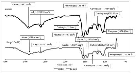 FTIR analysis was conducted to determine the functional groups involved in the Cr(VI) binding (Figure 6). In the control sample, the first peak observed at 3296.20 cm−1 was shifted to 3289.01 cm−1 in cells with Cr(VI), which might be attributed to the stretching of the –NH bond of amino groups and the presence of hydroxyl (-OH) groups. The change in peak position in cells with Cr(VI) was due to the complexation of amino and hydroxyl groups with Cr(VI). The same observation was also confirmed by [31]. The presence of the asymmetric stretching of the C-H bond of the aliphatic chains –CH2 and -CH3 was confirmed at peak 2927.82 cm−1 in the control, which was shifted to 2930.50 cm−1 in Cr(VI)-treated cells. This shift in peak manifested the binding of Cr(VI) to the functional group, which acted as a nucleophile [19]. The weak stretching vibration that was detected at the wavelength of 1512 cm−1 signified the presence of a carbonyl (C=O) group in both samples. However, Cr(VI) complexation was found to have more affinity to occur on the other side of the aliphatic chains, which resided by the amide groups. This was revealed by the shifting of amide I and amide II peaks at 1647.61 cm−1 and 1537.31 cm−1 to 1646.18 cm−1 and 1540.46 cm−1, respectively [32]. The role of the carboxylate (-COOH) functional group in Cr(VI) adsorption was also observed through the stretching of peak 1453.96 cm−1 and 1233.65 cm−1 to 1453.43 cm−1 and 1230.95 cm−1, respectively [33]. In addition, [34] reported that the bands in the region 1500–1200 cm−1 also signified the deformation of the aliphatic chains –CH2 and the angular deformation of C–C–H and H–C–O, which showed the complexation of Cr(VI) to the functional groups that have been discussed previously. The stretching of peak 1071.65 cm−1 to 1072.44 cm−1 confirmed the complexation of Cr(VI) to the phosphate functional group found in lipopolysaccharide, which was among the main cell membrane constituents of Gram-negative bacteria [35]. This FTIR finding confirmed the involvement of several functional groups that made up the cell membrane in the adsorption of Cr(VI), which was also reported by [36].