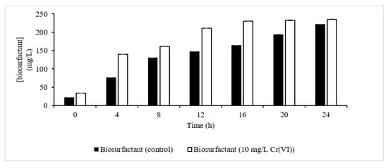 Biosurfactant synthesis profile. Biosurfactant synthesis in control experiment (dark column); biosurfactant synthesis in the presence of 10 mg/L Cr(VI) (clear column).