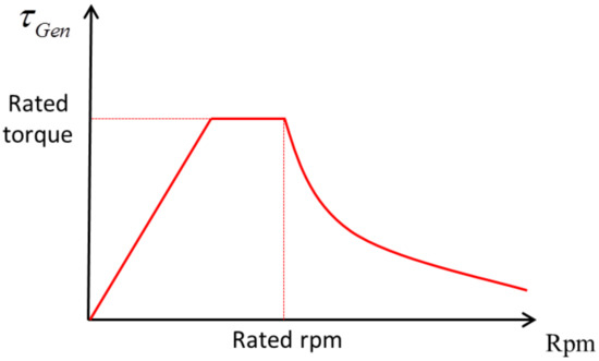 where J2 is the moment of inertia about the elements influenced by the gearbox such as the generator shaft, flywheel to smooth the velocity of generator also the moment of inertia of generator. The last rope tension-inducing factor is the generator torque. The generator rotates when the power transmitted equals the torque generated. The generator torque can be set by the user. It can be expressed as a constant, curve, or function. If the initial generator torque equals the rated torque, a high impact load is generated at the initial generation. Figure 2 illustrates the torque curve, in which the torque is increased by increasing the rotational speed. If the generator rotates over the rated speed in the rated torque condition, it will produce over-electricity and cause damage to the generator. Therefore, to avoid the situation, the rated torque should be reduced if the generator speed exceeds the rated speed. Figure 2 shows the shape of the torque curve applied in this study.