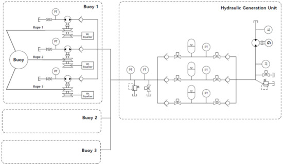 The main components of a hydraulic PTO are the hydraulic pump, accumulator, and hydraulic motor. The pump and motor ensure high efficiency even at low speeds, eliminating the need for a gearbox. This PTO counters the seasonal variations of waves by controlling the maximum and minimum pressure inside the accumulator. As the accumulator is charged and transfers energy to the generator, the generator can operate in a steady state at the rated speed. Because the hydraulic PTO stores the energy transferred from the ropes in the accumulator and delivers it to the generator, it requires fewer generators and electrical equipment than the mechanical PTO does. Table 4 summarizes the specifications of the hydraulic components used for the simulation, for calculation of the energy conversion efficiency of the hydraulic system.