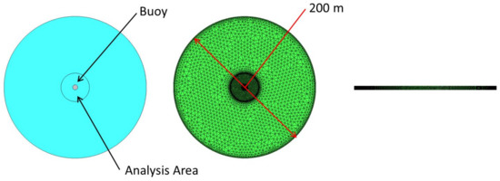 The FEM model used for the simulation had approximately 64,102 nodes and 360,000 elements (Fluid domain-tetrahedral 3D elements, Surface domain-trigonal 2D elements) [41] (Figure 4). In consideration of the wavelength and depth of the waves, the element size recommended by seaFEM was applied, and the analysis area around the buoy was densified to construct the FEM model. The mesh size should be no larger than one fifth of the smallest wavelength. Recommended value, at least, one tenth. Mesh size at the outlet should be no larger than one fifth of the distance to the reference point. Mesh size at the portion of the bottom located right below the body should be no larger than one fifth of the computational depth [42]. The meshes of the buoy and analysis areas were created denser than the recommended size. The analysis area includes all area where the buoy moves.