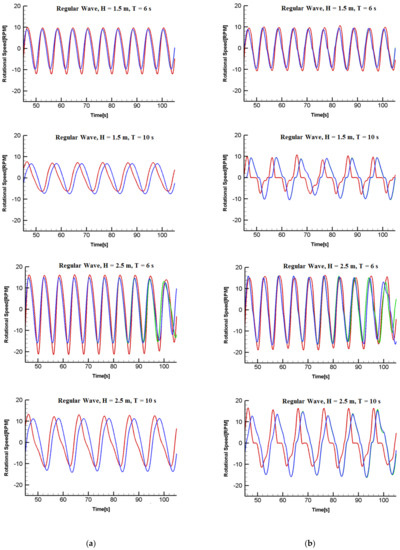 Figure 5 illustrates the rotational speed of the rope drum of the mechanical and hydraulic PTO. Although varying under the same wave condition owing to the difference in tension produced by the two PTOs, the rotational speed exhibits a regular wave behavior. The shorter the wave period and the taller the wave, the higher the rotational speed. In Figure 5, rope drums 2 and 3 have the same rotational speed because of their symmetry in the wave direction. However, in CASE22 (2.5 m, 6 s), the buoy rotated in the yaw direction. In the mechanical PTO, a rope drum rotates the generator via a gearbox. In the hydraulic PTO, hydraulic oil is filled in the accumulator up to the same height as the rotation displacement by rotating the hydraulic pump. The rotation of the rope drum in the mechanical PTO transmits the rotational motion unidirectionally using a ratchet gear. The hydraulic PTO does not require a ratchet gear because of the bypass of its hydraulic circuit.