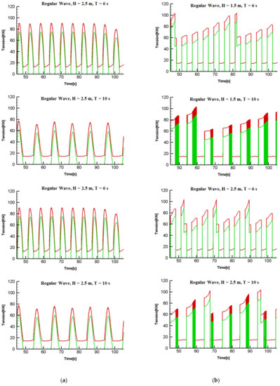 Figure 6b illustrates the tensile vibration at the point where the wave commences and ends the ascent of the buoy. This phenomenon is explained as follows: the brief movement of a floating body results from insufficient rope tension to charge the accumulator. This phenomenon occurs when the accumulator is charged with high pressure, confirming the need to install accumulators as damper in the hydraulic circuit. Table 5 and Table 6 list the results of rope tension for 60 s (45–105 s) of CASES 1–30.