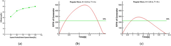 Figure 7b,c show the generator behavior in CASE16 and CASE23. In CASE16, the generator operates at the rated speed (450 rpm), but the time—exceeding 50% of the rated speed—is 68.2% of the generation time of one cycle.