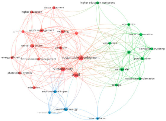 Figure 3 shows the author keywords co-occurrences (minimum three occurrences) for selected articles of Search 1 (53 articles). The most occurring author keywords are: “sustainable development”, “sustainability”, “Brazil”, “recycling”, and “waste management.” Other keywords with high occurrence are related to water and energy: “wastewater”, and “renewable energy.” This figure identifies that the most researched topics in these articles are related to waste management and energy efficiency and that the HEIs involved are mainly from Brazil.