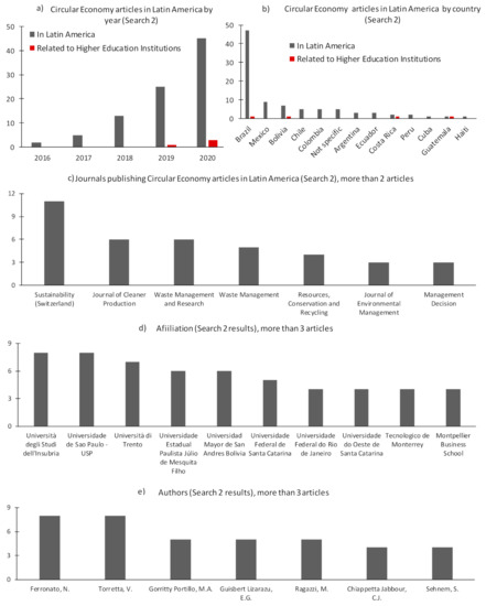Figure 2 provides insights from the results of Search 1 [70,71,72,73,74,75,76,77,78,79,80,81,82,83,84,85,86,87,88,89,90,91,92,93,94,95,96,97,98,99,100,101,102,103,104,105,106,107,108,109,110,111,112,113,114,115,116,117,118,119,120,121]. Figure 2 presents the number of articles by CE keyword, year, country, journal, and affiliation. This information allows scholars to understand how activities, considered “circular” to some degree, were addressed without considering the current CE concept. Figure 2a shows the CE keywords and the number of articles with topics related to each keyword. Those with more results are associated mainly with waste management (recycling, collection, and reuse) and energy (renewable and biogas). The number of articles on related CE activities has increased in the last years; 77% were published after 2015, and 30% only in 2020, as shown in Figure 2b. This shows the increasing trend in topics related to CE in LA countries where HEIs are involved. It is important to note that most of these studies do not address the CE concept as understood in this article but address topics related to CE keywords.