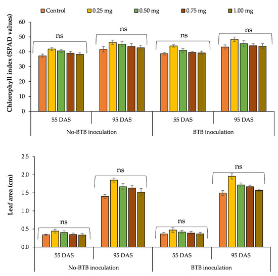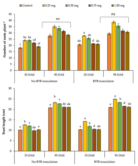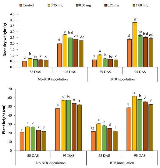 The number of roots, the roots’ length and dry weight, and the plant height from 55–95 DAS were significantly altered by B application, BTB inoculation and their interaction, while the B–BTB inoculation interaction had a non-significant effect on the chlorophyll index and leaf area (Table 1).