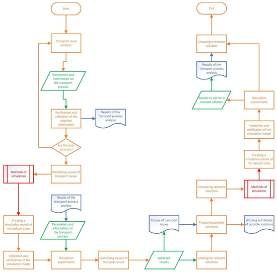 The use of computer simulation to tackle transport problems is described by the algorithm in Figure 1. This suggests that computer simulation can be used twice. The first use is within the analytical phase when the simulation model is amassing data and materials to suggest a solution. The second use of the simulation model is implemented in the designing phase when it is necessary to conduct a large number of experiments and evaluations with the intent to assess individual alternative solutions. This simulation method can also be used to compare the original state with the suggested solution. In the future, the resulting model may be applied to the traffic of the transport process and to answer “what if?” questions.
