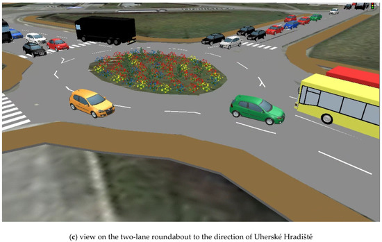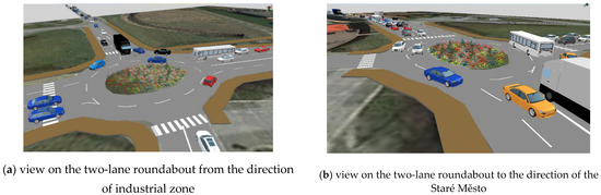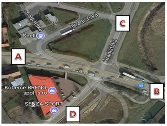 The traffic hub is situated on the traffic artery connecting Kunovice, Uherské Hradiště, and Staré Město (Figure 2). The traffic volume is greatest on the east–west axis in both directions. The traffic situation is complicated in this hub by severe traffic congestions during the rush hour.
