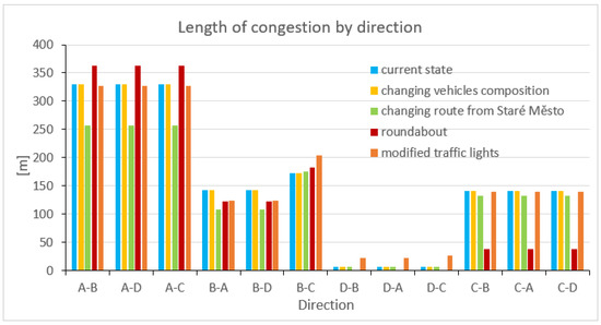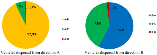 Upon leaving the shopping centers, most vehicles continue to Uherské Hradiště (Figure 4). Traffic congestions are caused by a large number of vehicles heading to the shopping center and the short duration of the green signal (18 s). The number of vehicles from direction D (Figure 4) is negligible (120 vehicles) considering the total number of vehicles at the intersection. No traffic congestion negatively influences the situation at the specific traffic hub.