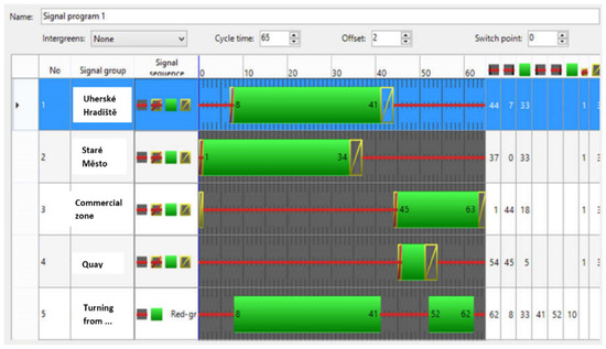 Figure 5 suggests a signal program for the intersection in Uherské Hradiště. The cycle length is 65 s in the basic model. The duration of the color green for individual directions is as follows: